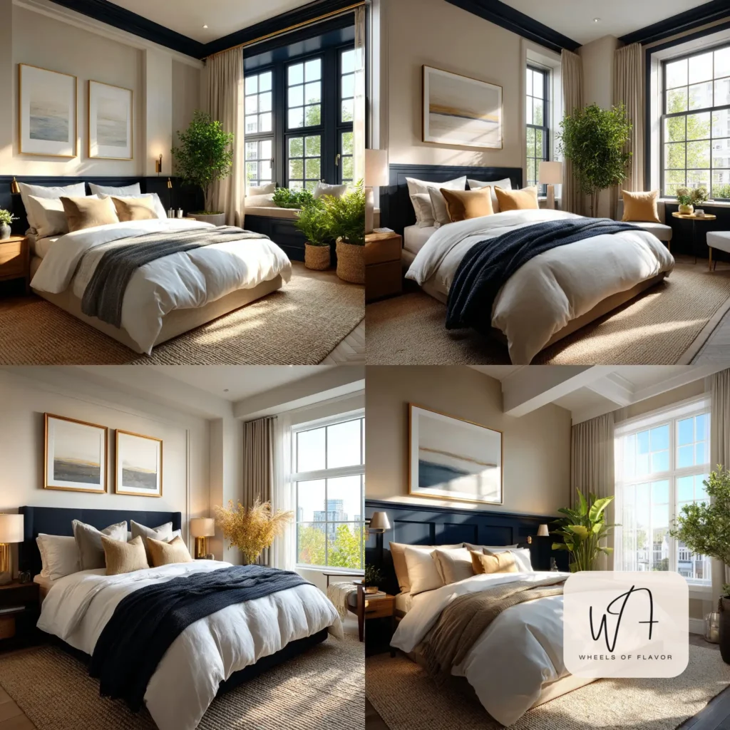 In bedrooms, light walls with dark trim foster a serene yet sophisticated vibe. Paint walls in a soft ivory and frame them with deep navy trim for a calming effect. Add textured bedding and metallic accents to complete the look. This contrast creates a cozy, inviting atmosphere perfect for relaxation.