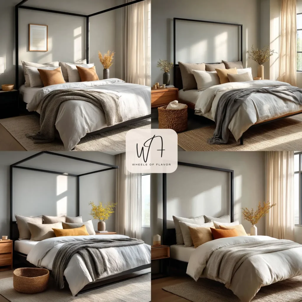 For an urban edge, select a low canopy bed with a raw metal frame in matte black or gunmetal. Combine it with exposed brick walls, concrete floors, and leather accents. This bold look is perfect for lofts or modern apartments.