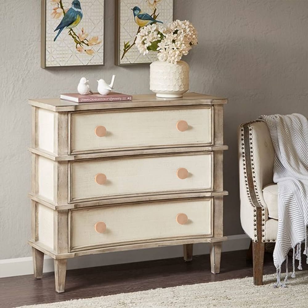 Next to your sofa, add the Cavana 3 Drawers Apothecary Accent Chest. Not only is it super cute and vintage-inspired, but it also doubles as hidden storage. You can even use it as a side table—perfect for holding snacks 🍿 or your favorite lamp.