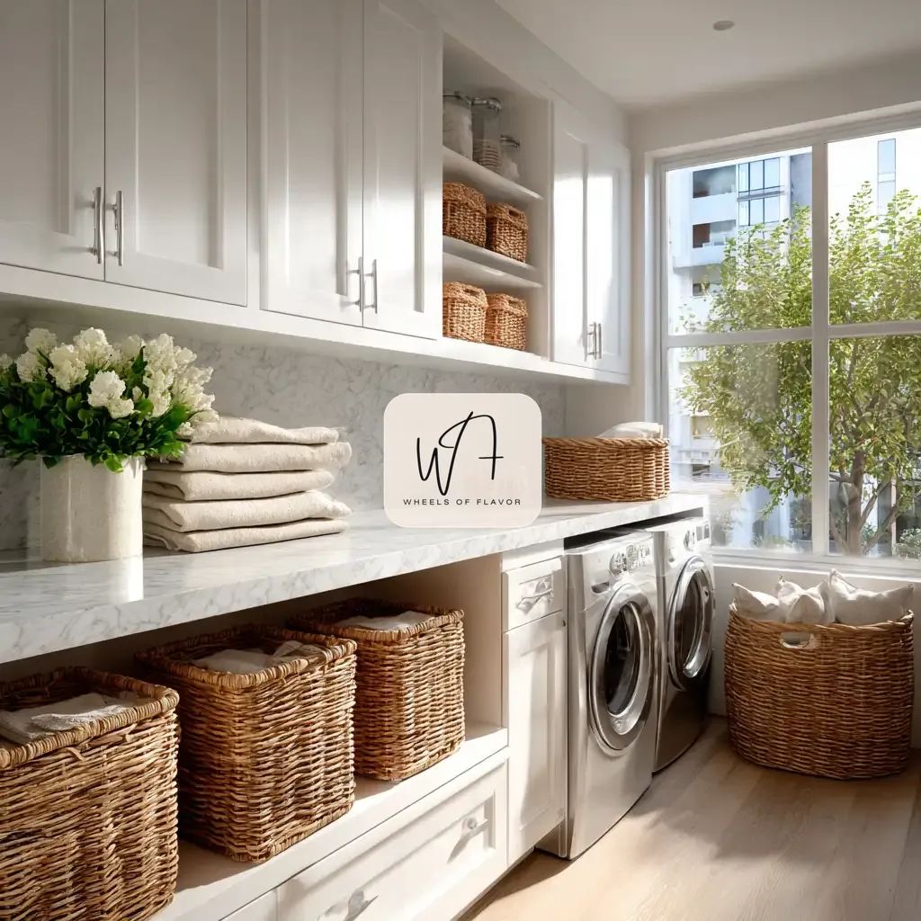 Countertops and flooring in modern laundry rooms balance beauty and durability. Quartz or granite countertops resist stains and provide ample workspace for folding clothes. For flooring, porcelain tiles or luxury vinyl planks offer water resistance and easy maintenance. Neutral tones like white, gray, or soft beige create a clean, timeless look, while bold accents like matte black fixtures add a touch of sophistication.